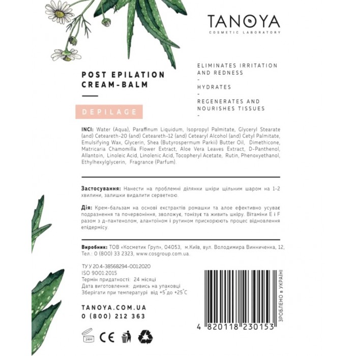 Производитель: Tanoya Страна производитель: Украина Применение средства: После депиляции Тип депиляционного средства: Крем Тип кожи: Все типы кожи Область применения: Ноги, Руки, Тело, Бедра, Интимные зоны Назначение и результат: Снятие воспаления, Снятие раздражения, Успокоение Классификация косметического средства: Профессиональная Пол: Унисекс Упаковка средства: Флакон с дозатором Объем: 200 мл