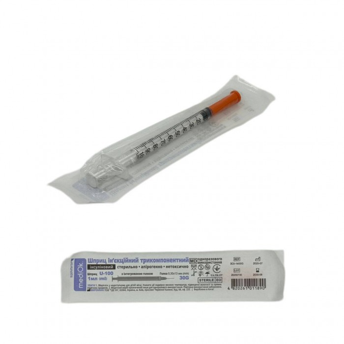Шприц ін'єкційний інсуліновий mediOk використовується для підшкірних ін’єкцій. Термопластичний ущільнювач поршня забезпечує плавний рух та герметичність шприца. Рельєфний наголос для пальців дозволяє максимально контролювати процес введення лікарського засобу.